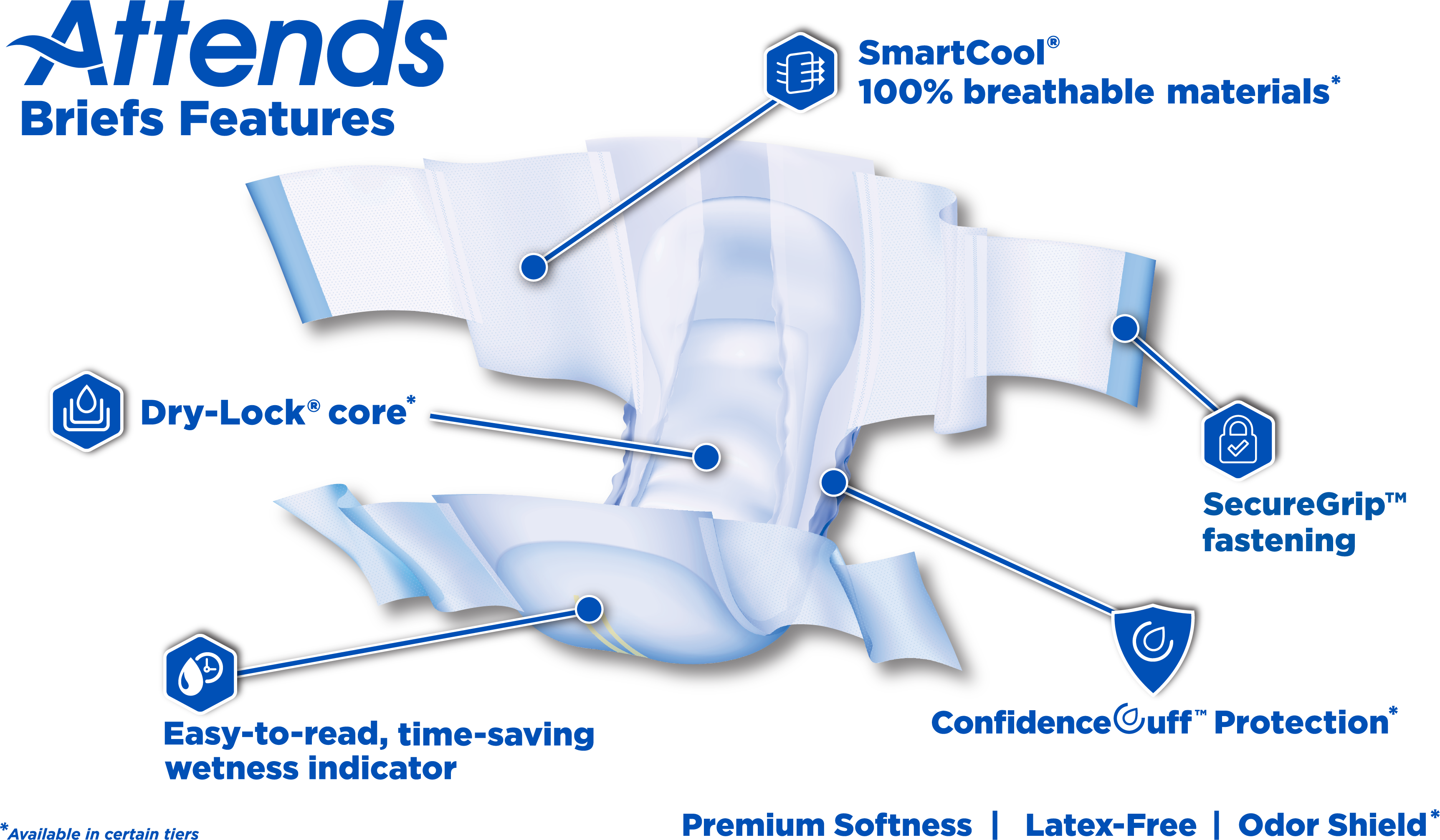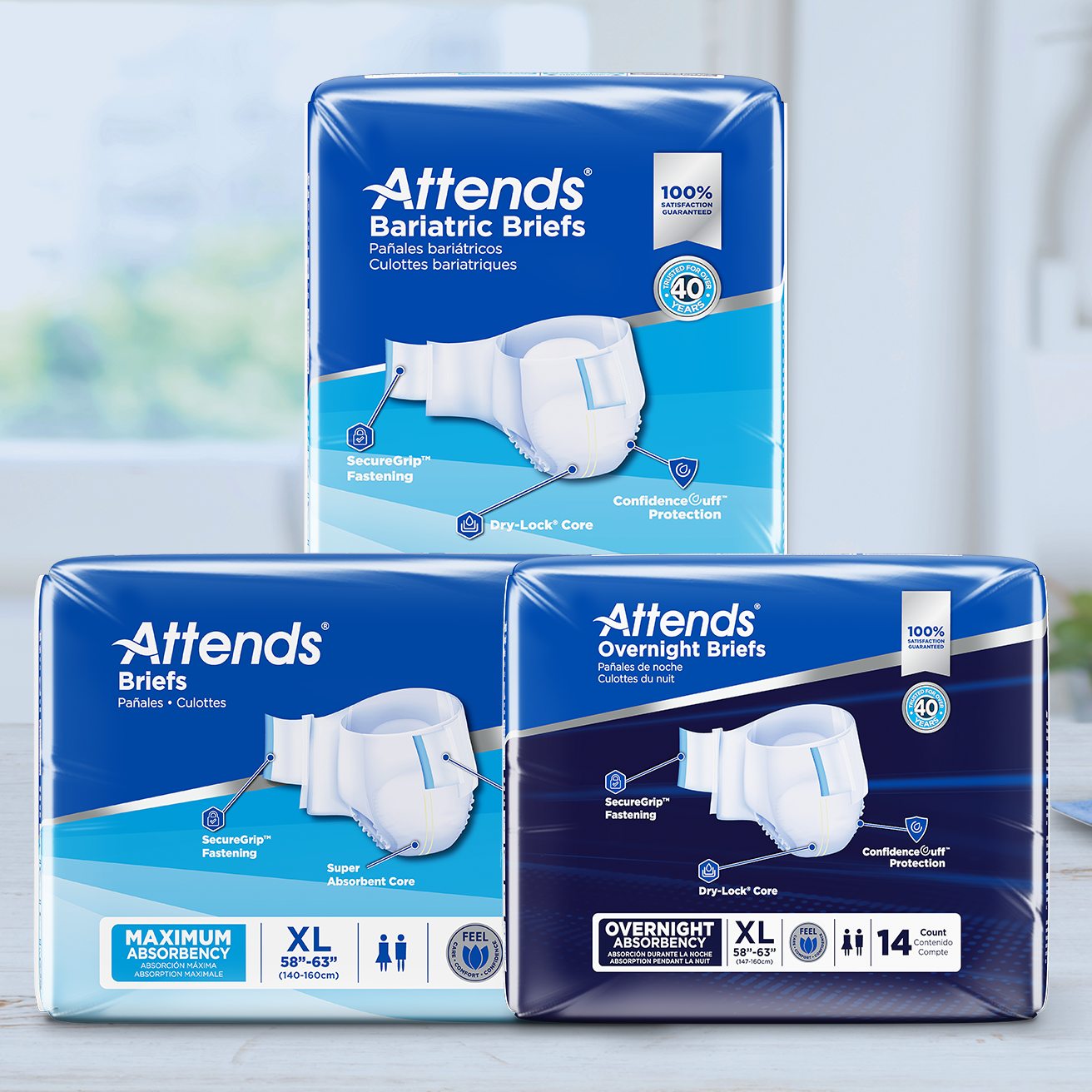 The new Attends Briefs have been upgraded with a series of enhancements designed to fit more securely. The new SecureGrip™ fastening provides a reliable and snug fit with an expanded fastening area, improving grip and easy application on the brief.
